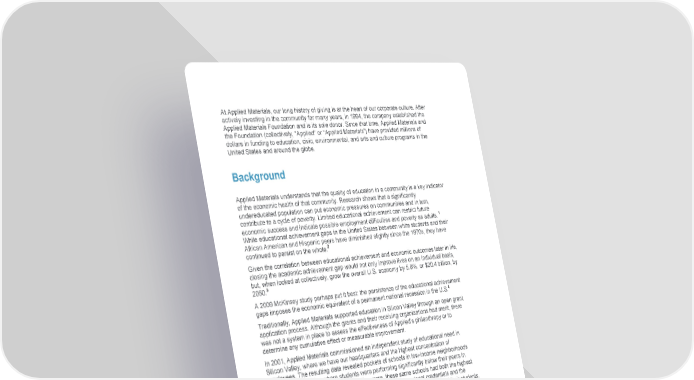 At Applied Materials, our long history of giving is at the heart of our corporate culture. After actively investing in the community for many years, in 1994, the company established the Applied Materials Foundation and is its sole donor. Since that time, Applied Materials and the Foundation (collectively, “Applied” or “Applied Materials”) have provided millions of dollars in funding to education, civic, environmental, and arts and culture programs in the United States and around the globe. Background Applied Materials understands that the quality of education in a community is a key indicator of the economic health of that community. Research shows that a significantly undereducated population can put economic pressures on communities and in turn, contribute to a cycle of poverty. Limited educational achievement can restrict future 1 economic success and indicate possible employment difficulties and poverty as adults. While educational achievement gaps in the United States between white students and their African American and Hispanic peers have diminished slightly since the 1970s, they have 2 continued to persist on the whole. Given the correlation between educational achievement and economic outcomes later in life, closing the academic achievement gap would not only improve lives on an individual basis, but, when looked at collectively, grow the overall U.S. economy by 5.8%, or $20.4 trillion, by 3 2050. A 2009 McKinsey study perhaps put it best: the persistence of the educational achievement 4 gaps imposes the economic equivalent of a permanent national recession in the U.S. Traditionally, Applied Materials supported education in Silicon Valley through an open grant application process. Although the grants and their receiving organizations had merit, there was not a system in place to assess the effectiveness of Applied’s philanthropy or to determine any cumulative effect or measurable improvement. In 2001, Applied Materials commissioned an independent study of educational need in Silicon Valley, where we have our headquarters and the highest concentration of employees. The resulting data revealed pockets of schools in low-income neighborhoods throughout the region where students were performing significantly below their peers in more affluent school communities. Furthermore, these same schools had both the highest percentages of teachers with minimum or inadequate professional credentials and the lowest percentage of educators with specialized training to meet the needs of their students. In response, Applied Materials launched its Education Initiative to focus on two high-needs communities in San Jose with the largest concentration of underachieving students in the region – the downtown core and the east side. The goal is to increase the number of students who graduate from high school with the skills, requirements and motivation to succeed in college. Attaining this goal requires addressing the academic achievement gap between higher performing white and Asian students and their Latino and African American peers, as well as a long-term commitment to the high-needs communities. 1 http://www.urban.org/research/publication/child-poverty-and-its-lasting-consequence/view/full_report 2 https://www.americanprogress.org/issues/race/report/2014/11/10/100577/the-economic-benefits-of-closing-educational-achieve 3 https://www.americanprogress.org/issues/race/report/2014/11/10/100577/the-economic-benefits-of-closing-educational-achieve 4 http://dropoutprevention.org/wp-content/uploads/2015/07/ACHIEVEMENT_GAP_REPORT_20090512.pdf 2 | Applied Materials Education Initiative