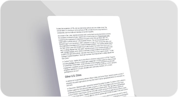 funded the expansion of PBL into two elementary schools and one middle school. The school district is creating an entire pathway of PBL schools that encourage students to collaborate, communicate and develop critical-thinking skills. As it does in San Jose, Applied promotes both in-school and out-of-school efforts to narrow the academic achievement gap. Applied was a founding sponsor of Breakthrough Austin, supporting the organization’s expansion throughout Austin ISD and Manor ISD. The organization currently serves 1,250 students annually. The on-time graduation rate of Breakthrough Austin students is 100% compared to a rate of 78% among their peers, and the organization averages a 92% direct-to-college enrollment. This success persists beyond the high school years with Breakthrough Austin students four times more likely to go on to earn a college degree than their peers. Applied pursues similar outcomes through its work with College Forward, which strives to increase college enrollment and persistence of students through personalized, near-peer coaching and a strong support network. To date, College Forward students in Texas are five times more likely to earn a college degree than 7 their peers. In Central Texas, Applied also funds efforts to introduce young women to STEM. Programs, including GirlStart, strive to increase girls’ engagement in STEM careers by offering a range of workshops, mentorships, camps and after-school programs designed to promote early engagement, academic success and persistence in the STEM workforce. In 2015, Girlstart's programs reached 23,172 girls, educators and community members, 97% of whom 8 participated at no cost. Other U.S. Cities In addition to its grantmaking efforts in Silicon Valley and Central Texas, Applied supports a variety of education-focused organizations serving other North American geographies where our employees live and work. In Gloucester, Massachusetts, Applied has funded Gloucester Education Foundation (GEF)’s efforts to bolster support for innovative education programs. In 2015, discouraged by the low number of girls continuing to pursue STEM-related subjects beyond middle school, GEF launched a comprehensive study of factors impacting the number of female students exiting the STEM education pipeline at Gloucester High School. Specific recommendations from the study will guide the high school’s course selection and programming in an effort to close the gender gap in STEM education in the years to come. Supporting the development of new teachers has also been a well-documented pain-point for districts across the nation. The New Teacher Center (NTC) seeks to address this challenge by accelerating the effectiveness of new teachers, experienced teachers and school leaders. Applied has funded NTC teacher professional development efforts in San Jose, CA; Portland, OR; and Kalispell, MT. NTC’s programming in these regions has resulted in more effective classrooms, increased student academic performance and cost savings for the districts. An independent evaluation of NTC’s work found that after just one year, students of NTC-supported teachers gained 2 to 3.5 months of additional learning in reading compared to non-NTC supported teachers. The study also found that NTC-supported teachers in the study return to the district at a higher rate (86%) than traditionally district-supported teachers 9 (80%). 7 www.collegeforward.org 8 http://www.girlstart.org/about-us/by-the-numbers 9 https://newteachercenter.org/blog/2016/08/10/new-i3-research-shows-student-achievement-gains-continue-with-ntc- support/?utm_source=hs_email&utm_medium=email&utm_content=33258363&_hsenc=p2ANqtz- 9PqYH9Q_wkQbww6gGBzExhMBK1tGjOxck6sJ4Xm-BBWwgNBocpIFNxdzqfADjA_MrDuZ-FYDG4pAsDlc8pep2Z2pvTJw&_hsmi=33258363 6 | Applied Materials Education Initiative