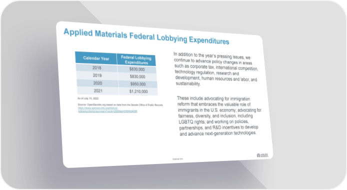 Applied Materials Federal Lobbying Expenditures In addition to the year’s pressing issues, we Calendar Year Federal Lobbying continue to advance policy changes in areas Expenditures such as corporate tax, international competition, 2018 $830,000 technology regulation, research and 2019 $830,000 development, human resources and labor, and 2020 $950,000 sustainability. 2021 $1,210,000 As of July 15, 2022 These include advocating for immigration Source: OpenSecrets.org based on data from the Senate Office of Public Records reform that embraces the valuable role of https://www.opensecrets.org/federal- immigrants in the U.S. economy; advocating for lobbying/clients/summary?cycle=2020&id=D000024099 fairness, diversity, and inclusion, including LGBTQ rights; and working on policies, partnerships, and R&D incentives to develop and advance next-generation technologies. 1 | Applied Materials Confidential External Use