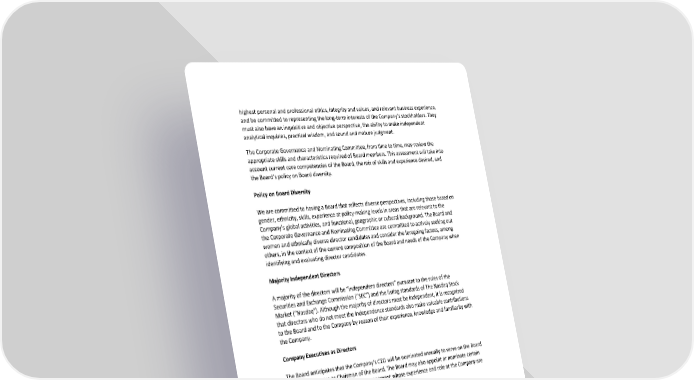 highest personal and professional ethics, integrity and values, and relevant business experience, and be committed to representing the long-term interests of the Company’s stockholders. They must also have an inquisitive and objective perspective, the ability to make independent analytical inquiries, practical wisdom, and sound and mature judgment. The Corporate Governance and Nominating Committee, from time to time, may review the appropriate skills and characteristics required of Board members. This assessment will take into account current core competencies of the Board, the mix of skills and experience desired, and the Board’s policy on Board diversity. Policy on Board Diversity We are committed to having a Board that reflects diverse perspectives, including those based on gender, ethnicity, skills, experience at policy-making levels in areas that are relevant to the Company’s global activities, and functional, geographic or cultural background. The Board and the Corporate Governance and Nominating Committee are committed to actively seeking out women and ethnically diverse director candidates and consider the foregoing factors, among others, in the context of the current composition of the Board and needs of the Company when identifying and evaluating director candidates. Majority Independent Directors A majority of the directors will be “independent directors” pursuant to the rules of the Securities and Exchange Commission (“SEC”) and the listing standards of The Nasdaq Stock Market (“Nasdaq”). Although the majority of directors must be independent, it is recognized that directors who do not meet the independence standards also make valuable contributions to the Board and to the Company by reason of their experience, knowledge and familiarity with the Company. Company Executives as Directors The Board anticipates that the Company’s CEO will be nominated annually to serve on the Board and may also serve as Chairman of the Board. The Board may also appoint or nominate certain other members of the Company’s management whose experience and role at the Company are expected to help the Board fulfill its responsibilities. Limitation of Service on Other Public Company Boards Directors must be willing to devote sufficient time to carry out their duties and responsibilities effectively, and should be committed to serve on the Board for an extended period of time. Each Board member is expected to ensure that other existing and planned future commitments do not materially interfere with his/her service as a director. Directors are encouraged to limit the number of other boards (excluding non-profit) on which they serve to ensure that they can meet their commitments to the Company and do not create potential conflicts of interest. The Board has adopted a policy limiting the number of other public company boards on which each director may serve to four (4). Directors may not serve on the board of directors of any other public or private company without obtaining prior approval from the Corporate Governance and Corporate Governance Guidelines 3.11.2022 3