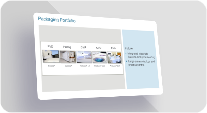 Packaging Portfolio PVD Plating CMP CVD Etch Future Integrated Materials Solution for hybrid bonding Large-area metrology and Endura® Mustang® Reflexion® LK Producer® CVD Producer® Etch process control