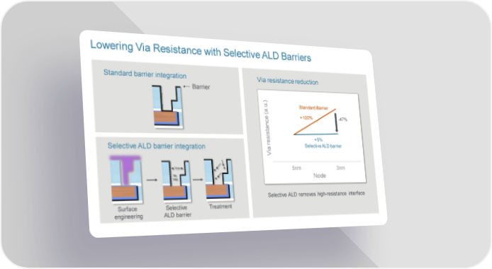 Lowering Via Resistance with Selective ALD Barriers Standard barrier integration Via resistance reduction Barrier .) .u Standard Barrier a e ( +100% -47% c an t s i +5% es Selective ALD barrier integration r Selective ALD barrier a i V Thin 5nm 3nm No Node dep Selective ALD removes high-resistance interface Surface Selective Treatment engineering ALD barrier