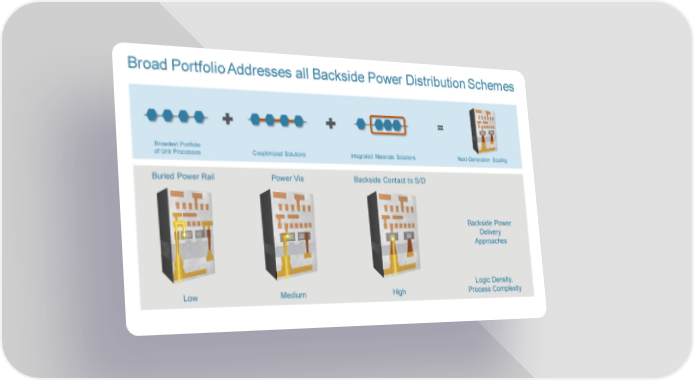 Broad Portfolio Addresses all Backside Power Distribution Schemes = Broadest Portfolio of Unit Processes Cooptimized Solutions Integrated Materials Solutions Next-Generation Scaling Buried Power Rail Power Via Backside Contact to S/D Backside Power Delivery Approaches Logic Density, Low Medium High Process Complexity