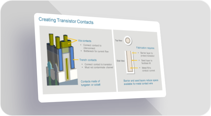 Creating Transistor Contacts Via contacts Top View Connect contact to Fabrication requires: interconnect Bottleneck for current flow Barrier layer to protect transistor Trench contacts Side View Seed layer to Connect contact to transistor facilitate fill Must not contaminate channel Metal fill to conduct current Contacts made of Barrier and seed layers reduce space tungsten or cobalt available for metal contact wire