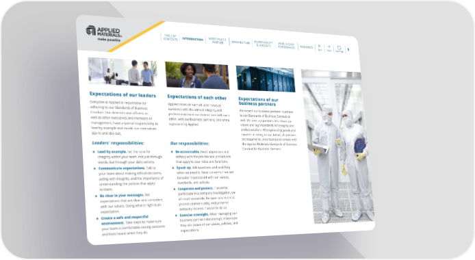 TABLE OF MOST VALUED RESPONSIBILITY WORLD CLASS CONTENTS INTRODUCTION PARTNER WINNING TEAM & INTEGRITY PERFORMANCE RESOURCES Back Next Last Page 5 Expectations of our leaders Expectations of each other Expectations of our Everyone at Applied is responsible for Applied relies on each of us to conduct business partners adhering to our Standards of Business ourselves with the utmost integrity and We expect our business partners to adhere Conduct. Our directors and officers, as professionalism in our interactions with each to our Standards of Business Conduct as well as other executives and members of other, with our business partners, and when well. We seek out partners who share our management, have a special responsibility to representing Applied. values and high standards for integrity and lead by example and model our core values professionalism. When providing goods and day-in and day-out. services or acting on our behalf, all partners are required to understand and comply with Leaders’ responsibilities: Our responsibilities: the Applied Materials Standards of Business ■ Lead by example. Set the tone for ■ Be accountable. Read, appreciate and Conduct for Business Partners. integrity within your team, not just through comply with the policies and procedures words, but through your daily actions. that apply to your roles and functions. ■ ■ Communicate expectations. Talk to Speak up. Ask questions and seek help your team about making ethical decisions, when we need it. Raise concerns if we see acting with integrity, and the importance of behavior inconsistent with our values, understanding the policies that apply standards, and policies. to them. ■ Cooperate and protect. If asked to ■ Be clear in your messages. Set participate in a company investigation, we expectations that are clear and consistent all must cooperate. Be open and truthful, with our values. Doing what is right is an protect confidentiality, and preserve expectation. company records if asked to do so. ■ Create a safe and respectful ■ Exercise oversight. When managing our environment. Take steps to make sure business partner relationships, make sure your team is comfortable raising concerns they are aware of our values, policies, and and feels heard when they do. expectations.
