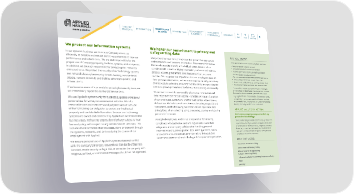 TABLE OF MOST VALUED RESPONSIBILITY WORLD CLASS CONTENTS INTRODUCTION PARTNER WINNING TEAM & INTEGRITY PERFORMANCE RESOURCES Back Next Last Page 9 We protect our information systems We honor our commitment to privacy and In our dynamic business, we must use Company assets as safeguarding data DID YOU KNOW? efficiently as possible and remain alert to opportunities to improve Many countries have data privacy laws that govern the appropriate Here are some information security best practices: performance and reduce costs. We are each responsible for the collection and use of personal information. This means information • Keep computer updates current proper use of Company property, facilities, systems, and equipment. that can be used to identify an individual, either alone or when • Only open emails from known senders In addition, we are each responsible for protecting the resources combined with other identifying information, such as email address, • Request permission before installing software entrusted to us. We protect the security of our technology systems physical address, government identification number, or phone • Do not bypass security controls and networks from cybersecurity threats, hacking, service denial number. We recognize the importance that our employees place on • Do not use unauthorized removable storage devices • Keep passwords secure, never share them attacks, ransom demands and theft by adhering to policies and their personal information, and we are committed to fairly, sensitively • Do not trust public Wi-Fi (at airports, hotels, etc.) infosec alerts. and respectfully collecting and using this data while incorporating the • Avoid commingling business and personal files core data privacy principles of lawfulness, transparency, and security. Personal Information is any information relating to If we become aware of a potential or actual cybersecurity issue, we an identified, or identifiable, natural person, or other will immediately report this to the GIS Service Desk. We believe responsible stewardship of personal information and information that constitutes personal data under data helps maintain trust in Applied – whether personal information any applicable law. This includes, for example, name, We use Applied’s systems only for business purposes or incidental of our employees, customers, or other third parties with whom we contact information, national identification number, personal use for lawful, non-commercial activities. We take employee ID, face, fingerprints or handwriting, digital reasonable care and exercise sound judgment about such use do business. We help to maintain that trust by being respectful and identity, birthdays, and IT user credentials. while maintaining our obligation to protect our intellectual transparent, and by following our policies and all applicable data APPLIED VALUES IN ACTION property and confidential information. Because our technology privacy laws, when collecting, using, processing, storing, or disclosing systems are owned and controlled by Applied and are intended for personal information. Can I use my company computer to check my personal email and blogs? business uses, we have no expectation of privacy, subject to local As Applied employees, each of us is responsible for ensuring Some incidental personal use of company resources law and policy, with respect to any communication and data. This compliance with applicable laws and regulations, contractual is permitted, but if you wish to engage in discussion includes the information that we access, store, or transmit through obligations, and company policies when handling personal or promotion of political, social, religious, personal, the systems, networks, and devices during the course of our information and business partner data. When questions, issues, financial, or commercial views, you must do so on employment with Applied. or concerns arise, we consult a member of the Privacy & Data non-work personal time using your own personal email account and equipment. We ensure personal use of Applied’s systems does not conflict Governance team or others in the Legal & Compliance Organization. FIND OUT MORE: with the company’s interests, violate these Standards of Business Conduct, create security or legal risk, or associate the company with Document Retention Policy religious, political, or commercial messages that it has not approved. Global Internal Privacy Policy Global Security Image Taking & Audio Recording Policy Information Systems Security Governance Policy help/ privacy/