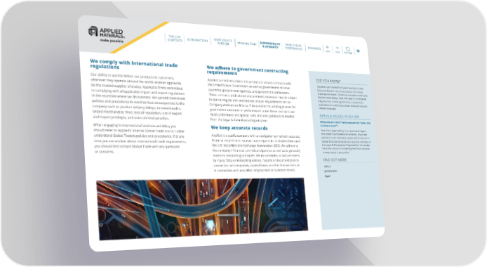 TABLE OF MOST VALUED RESPONSIBILITY WORLD CLASS CONTENTS INTRODUCTION PARTNER WINNING TEAM & INTEGRITY PERFORMANCE RESOURCES Back Next Last Page 16 We comply with international trade We adhere to government contracting regulations requirements DID YOU KNOW? Our ability to quickly deliver our products to customers, Applied sometimes enters into product or service contracts with Applied is prohibited from participating in trade wherever they operate around the world, enables Applied to the United States Government as well as governments of other boycotts that are not sanctioned by the United be the trusted supplier of choice. Applied is firmly committed countries, government agencies, and government contractors. States government. To ensure compliance with anti- to complying with all applicable import and export regulations These contracts and related procurement processes may be subject boycott laws, always have the Legal & Compliance in the countries where we do business. We uphold these trade to special regulations and impose unique requirements on the Organization review agreements, transactions, and letters of credit that contain potential boycott- policies and procedures to avoid serious consequences to the Company and our workforce. If involved in the bidding process for related language. company such as product delivery delays, increased audits, government contracts or performance under those contracts, we APPLIED VALUES IN ACTION seized merchandise, fines, loss of reputation, loss of export must understand any special rules and seek guidance as needed and import privileges, and even criminal penalties. from the Legal & Compliance Organization. What should I do if I feel pressured to “make the numbers work”? When engaging in international business activities, you We keep accurate records Your first responsibility is to record and report should refer to Applied’s internal Global Trade site to further information accurately and honestly. If you feel understand Global Trade’s policies and procedures. If at any Applied is a public company with an obligation to maintain accurate pressure to do otherwise, speak with someone in time you are unclear about international trade requirements, financial records and issue accurate reports to its shareholders and Global Ethics & Compliance or another member of you should first contact Global Trade with any questions the U.S. Securities and Exchange Commission (SEC). We adhere to the Legal & Compliance Organization. You always the company’s financial controls and policies as well as to generally have the option of contacting the Ethics Helpline, or concerns. anonymously if you prefer. accepted accounting principles. We do not make, or induce others to make, false or misleading entries, reports or documentation in FIND OUT MORE: connection with expenses, expenditures, or other transactions, or ethics/ in connection with any other employment or business record. globaltrade/ legal/