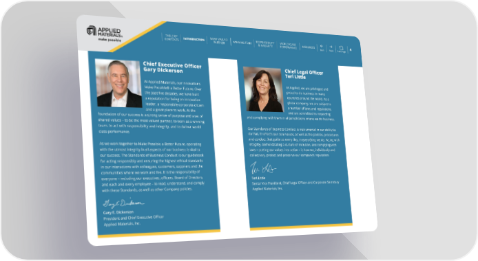 TABLE OF INTRODUCTION MOST VALUED WINNING TEAM RESPONSIBILITY WORLD CLASS RESOURCES 4 CONTENTS PARTNER & INTEGRITY PERFORMANCE Back Next Last Page Chief Executive Officer Chief Legal Officer Gary Dickerson Teri Little At Applied Materials, our innovations At Applied, we are privileged and Make Possible® a Better Future. Over proud to do business in many the past five decades, we have built countries around the world. As a a reputation for being an innovation global company, we are subject to leader, a responsible corporate citizen a number of laws and regulations, and a great place to work. At the and are committed to respecting foundation of our success is a strong sense of purpose and a set of and complying with them in all jurisdictions where we do business. shared values – to be the most valued partner, to work as a winning team, to act with responsibility and integrity, and to deliver world Our Standards of Business Conduct is instrumental in our ability to class performance. do that. It reflects our core values, as well as the policies, procedures and conduct that guide us every day, in everything we do. Acting with As we work together to Make Possible a Better Future, operating integrity, demonstrating a culture of inclusion, and complying with with the utmost integrity in all aspects of our business is vital to laws – putting our values into action – is how we, individually and our success. The Standards of Business Conduct is our guidebook collectively, protect and preserve our company’s reputation. for acting responsibly and ensuring the highest ethical standards in our interactions with colleagues, customers, suppliers and the communities where we work and live. It is the responsibility of everyone – including our executives, officers, Board of Directors, Teri Little and each and every employee – to read, understand, and comply Senior Vice President, Chief Legal Officer and Corporate Secretary with these Standards, as well as other Company policies. Applied Materials, Inc. Gary E. Dickerson President and Chief Executive Officer Applied Materials, Inc.