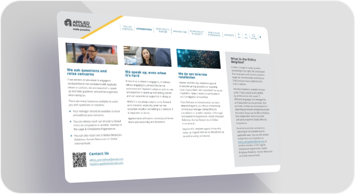 TABLE OF MOST VALUED RESPONSIBILITY WORLD CLASS CONTENTS INTRODUCTION PARTNER WINNING TEAM & INTEGRITY PERFORMANCE RESOURCES Back Next Last Page 6 What is the Ethics Helpline? It takes courage to speak up when something is not right. We understand We ask questions and We speak up, even when We do not tolerate that employees and business partners raise concerns it’s hard retaliation might be uncomfortable and anxious. That’s why we have established the If we witness or are asked to engage in If one of us is asked to engage in, or witness Applied prohibits any retaliation against Ethics Helpline. conduct that is not consistent with Applied’s others engaging in, conduct that is not anyone for asking questions or reporting The Ethics Helpline is available 24 hours values or policies, we are expected to speak consistent with Applied’s values or policies, we issues in good faith. We should feel free to ask a day, 7 days a week and is staffed up and seek guidance, and will be supported are expected to speak up and seek guidance, a question, make a report, or participate in by professionals who speak 11 when doing so. and can expect to be supported in doing so. any investigation without fear. different languages. It is managed by There are many resources available to assist While it is not always easy to come forward If you feel you, or someone else, has been an independent service provider that you with questions or concerns. with concerns, especially when we feel retaliated against, you should immediately provides confidential and anonymous ■ Your manager should be available to listen uncertain whether something is a violation, it contact your manager, Global Ethics & reporting services to companies around and address your concerns. is important to do so. Compliance or another member of the Legal the world. If you use the Ethics Helpline, Applied takes all reports seriously and treats & Compliance Organization, Global Employee the independent service provider ■ Relations, Human Resources, or Global will send a report to Global Ethics & You can always reach out directly to Global them with sensitivity and discretion. Ethics & Compliance or another member of Internal Audit. Compliance. the Legal & Compliance Organization. Anyone who retaliates against those who In certain countries, anonymous ■ speak up in good faith will be disciplined, up reporting is not available due to You can also reach out to Global Employee applicable laws. You can still contact Relations, Human Resources or Global to and including termination. Internal Audit. Global Ethics & Compliance at [email protected] or another member of the Legal & Contact Us Compliance Organization, Global [email protected] Employee Relations, Human Resources helpline.appliedmaterials.com or Global Internal Audit.