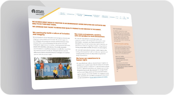 TABLE OF MOST VALUED RESPONSIBILITY WORLD CLASS CONTENTS INTRODUCTION PARTNER WINNING TEAM & INTEGRITY PERFORMANCE RESOURCES Back Next Last Page 11 WE ACHIEVE GREAT RESULTS TOGETHER IN AN ENVIRONMENT WHERE EMPLOYEES ARE SUPPORTED AND ABLE TO DO THEIR BEST WORK. DID YOU KNOW? WE LEVERAGE OUR TALENT TO BRING HIGH QUALITY PRODUCTS AND SERVICES TO THE MARKET. It is unlawful to make workforce-related decisions based on race, color, national origin, ancestry, religion, age, sex (including pregnancy, We continually build a culture of inclusion We create and maintain a positive, childbirth, or related medical conditions), sexual and integrity safe and productive work environment orientation, gender identity, marital status, physical disability, mental disability, medical condition, genetic information, family care We are inclusive in all our interactions and leverage our diversity and We share the responsibility for promoting teamwork and leave status, veteran status, or any other basis integrity to solve problems and innovate. We act with respect for cooperation, as well as maintaining a work environment in which prohibited by law. our colleagues and promote an inclusive, positive workplace where discrimination, harassment, and unsafe work practices are not APPLIED VALUES IN ACTION everyone feels a sense of belonging. We take action to increase tolerated. We use only merit and job criteria, such as experience and employment opportunities for women, underrepresented minorities, performance, in decisions regarding recruitment, hiring, promotion, Employees who know or suspect that they or people with disabilities, and veterans. We provide reasonable training, compensation, benefits, termination, and social programs. someone else have experienced discrimination accommodations to qualifying employees to enable them to perform should report this immediately – either to We must each adopt safe work practices, complete required safety their manager, Global Employee Relations, the essential functions of their job. We appreciate and value the training, and comply with all health and safety laws, regulations, and Human Resources, Global Ethics & Compliance, differences of others and always treat our colleagues and business another member of the Legal & Compliance partners with the utmost respect. company policies to protect the safety, health, and general well- Organization, or Global Internal Audit. being of our workforce. FIND OUT MORE: We honor our commitments to Corporate Responsibility human rights Global Policy Against Child and/or Forced Labor We respect the human rights and dignity of people throughout our Human Resources Policy Manual operations and our global supply chain. We comply with and expect Human Rights Statement of Principles our business partners to comply with: (i) laws that promote a diverse Statement under the California Transparency workforce, safe working conditions, and individual security; (ii) laws in Supply Chain Act that prohibit forced labor, the employment of underage children, ehs/ and human trafficking; and (iii) laws that prevent discrimination er/ against employees and workers based on their engagement in any lawful association. Our commitment and approach to these issues are demonstrated in our Human Rights Statement of Principles.