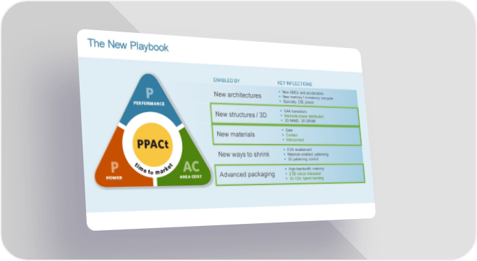 The New Playbook ENABLED BY KEY INFLECTIONS New ASICs and accelerators New architectures New memory / in-memory compute Specialty, CIS, power GAA transistors New structures / 3D Backside power distribution 3D NAND, 3D DRAM Gate New materials Contact Interconnect EUV enablement New ways to shrink Materials-enabled patterning 3D patterning control High-bandwidth memory Advanced packaging 2.5D silicon interposer 3D TSV, hybrid bonding