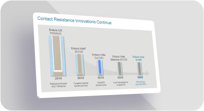 Contact Resistance Innovations Continue Endura iLB PVD/ALD Endura Volta® W CVD Endura Volta Co CVD Endura Volta Endura Ioniq Selective W CVD W IMS 2010 2016 2018 2020 2022 Radical-enhanced Tungsten carbide Cobalt fill Liner-free selective PVD W liner ALD TiNbarrier barrier and liner product suite tungsten fill and CVD W fill