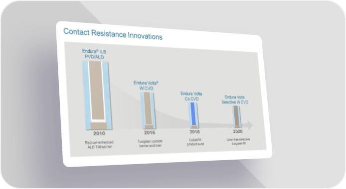 Contact Resistance Innovations Endura® iLB PVD/ALD Endura Volta® W CVD Endura Volta Co CVD Endura Volta Selective W CVD 2010 2016 2018 2020 Radical-enhanced Tungsten carbide Cobalt fill Liner-free selective ALD TiNbarrier barrier and liner product suite tungsten fill