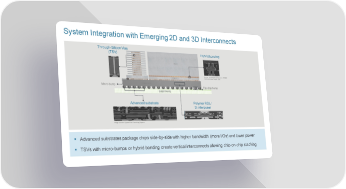 System Integration with Emerging 2D and 3D Interconnects Through-Silicon Vias (TSV) Hybrid bonding Chip 1 Source: TechInsights (Chipworks) IMX260 Chip 2 Camera Module Report, 2016 Micro-bump Polymer RDL Flip-chip bump Advanced substrate Polymer RDL/ Si interposer Image Sources: SystemPlus Consulting Reports Advanced substrates package chips side-by-side with higher bandwidth (more I/Os) and lower power TSVs with micro-bumps or hybrid bonding create vertical interconnects allowing chip-on-chip stacking