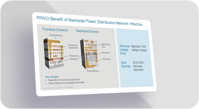 PPACtBenefit of Backside Power Distribution Network Inflection Frontside Scheme Backside Scheme Power delivery Power and Signal lines Reduced Maintain 10% signal lines only Voltage design margin Power rail Drop Power rail Transistor Power line Area 20 to 30% Savings cell area Power delivery reduction Key changes Separation of power and signal lines Power delivery from backside of the wafer Source: Adapted from multiple IMEC and ARM publications