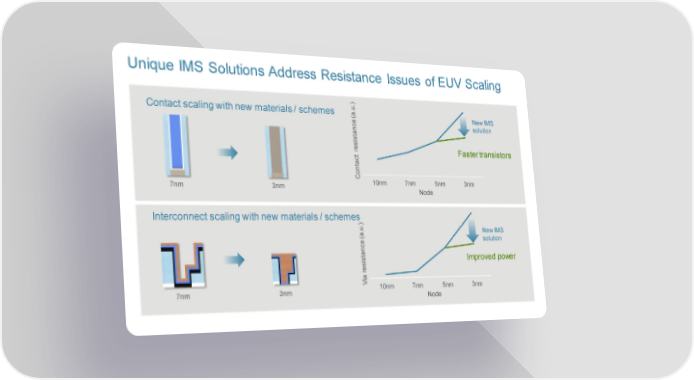 Unique IMS Solutions Address Resistance Issues of EUV Scaling Contact scaling with new materials / schemes .) (a.u New IMS nce solution resista Faster transistors tact Con10nm 7nm 5nm 3nm 7nm 3nm Node Interconnect scaling with new materials / schemes (a.u.) New IMS solution sistance Improved power re ia V 10nm 7nm 5nm 3nm 7nm 3nm Node