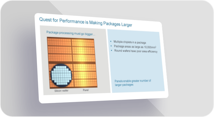 Quest for Performance is Making Packages Larger Package processing must go bigger… Multiple chipletsin a package Package areas as large as 10,000mm2 Round wafers have poor area efficiency Panels enable greater number of larger packages Silicon wafer Panel