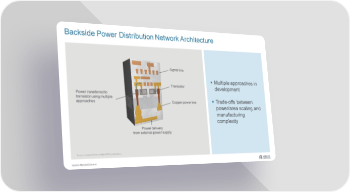 Backside Power Distribution Network Architecture Signal line Multiple approaches in Transistor development Power transferred to transistor using multiple approaches fs between Copper power line Trade-of power/area scaling and manufacturing complexity Power delivery from external power supply Source: Adapted from multiple IMECpublications Applied Materials External